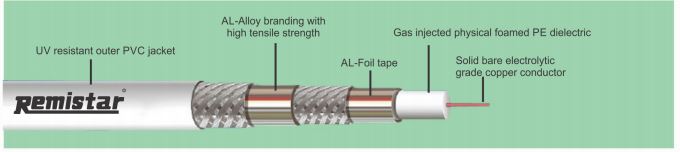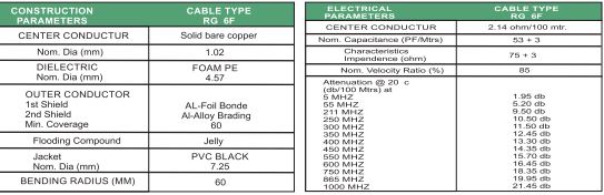 The central conductor is made of the solid electrical grade 99.97 pure copper to ensure better signal transmission.The conductor is insulated with nitrogen gas,which is superior and environment friendly as compared to chemical form.The Double screen of special composite type bonded aluminium foil and special grade aluminium alloy branding of 60% coverage ensure low loss in signal quality,additional mechanical strength and existence to avoide formation in tropical weather conditions.The specially in-house formulated PVC Compound used in jacketing is UV and abrasion resistant.